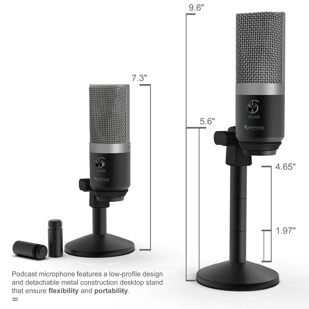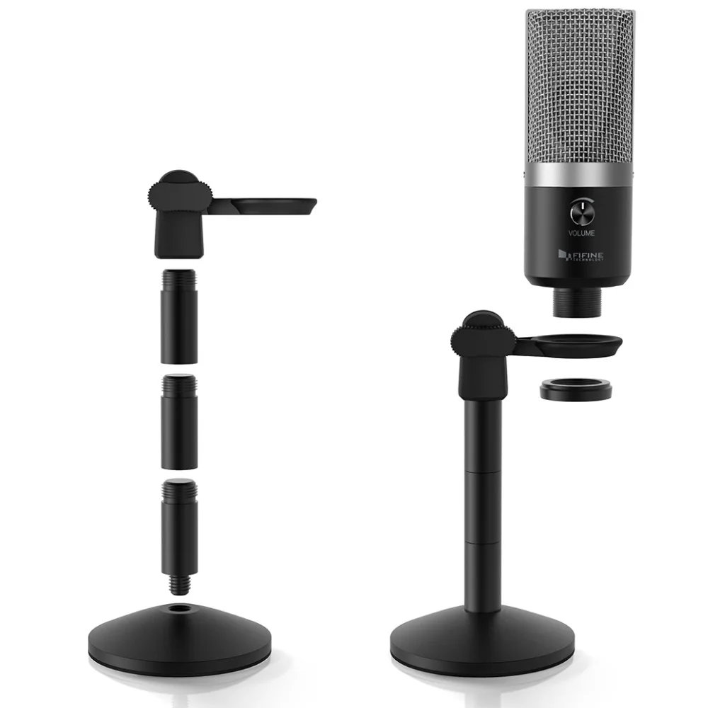 Height adjustable-- Vocal microphone features a low-profile design and detachable metal construction desktop stand that ensure flexibility and portability.Easy to assemble pc microphone stand with 3 detachable stand tube heighten from 1.97” to 4.65”.Thick, heavy base plate,can be moved around without falling over on other equipment.